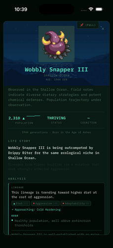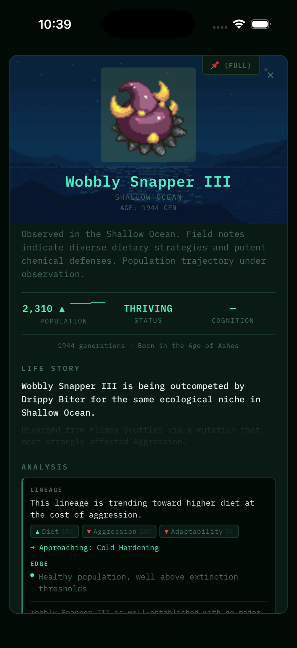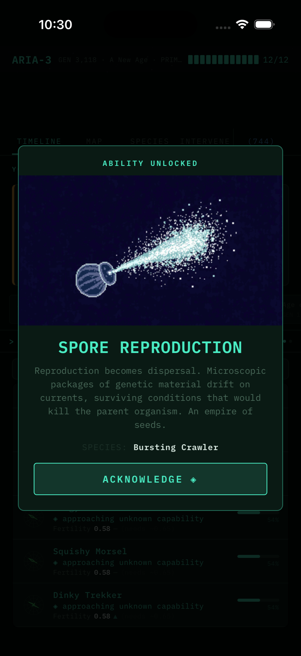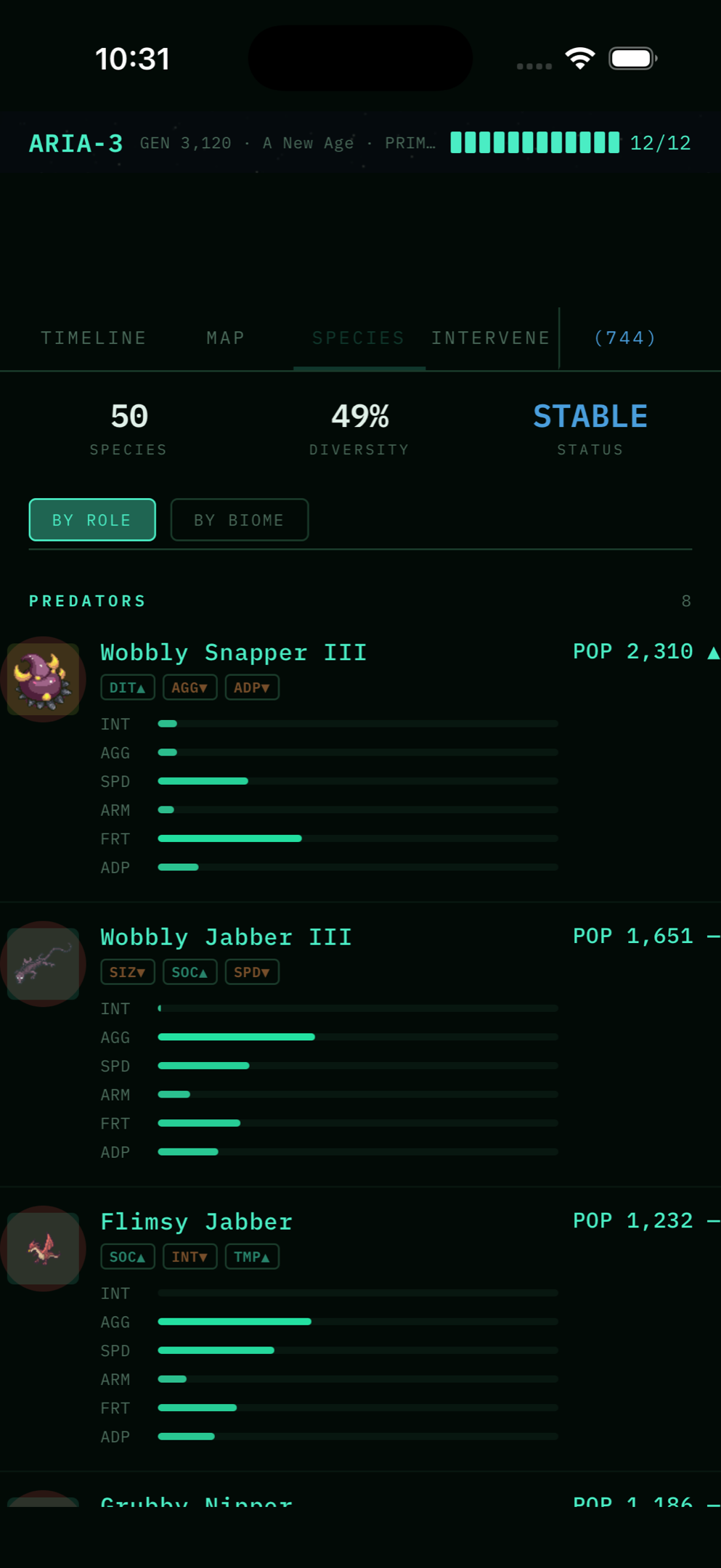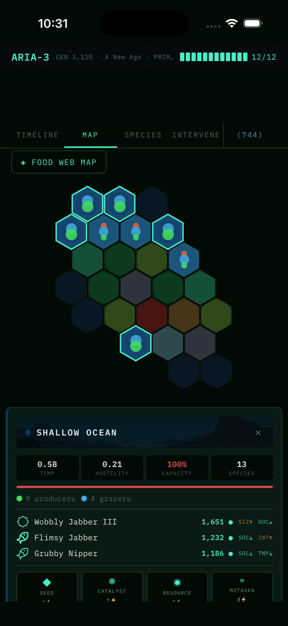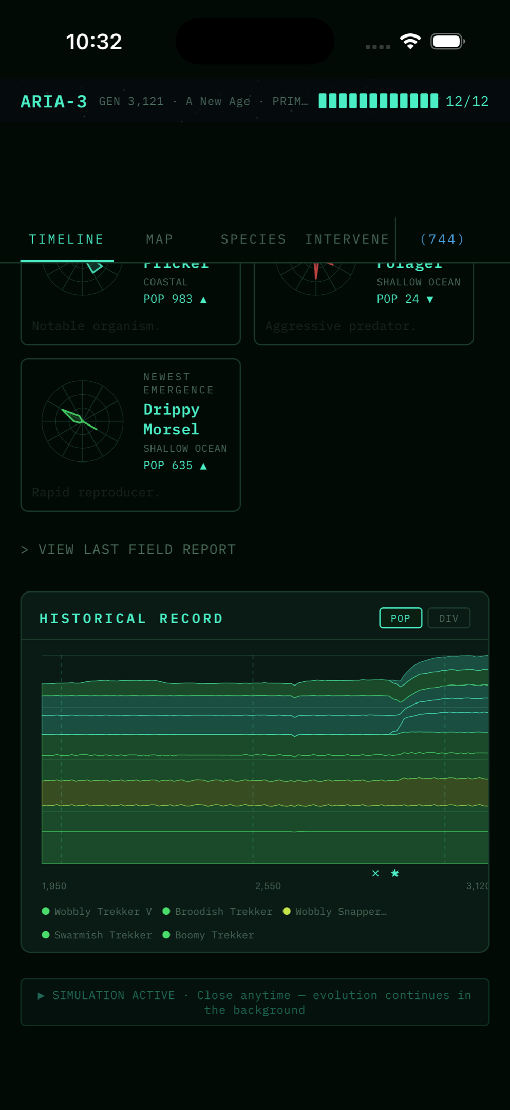You check in, read the field report, deploy catalysts to shape evolutionary pressure, and protect your favorite species as they evolve toward abilities like air breathing, pack hunting, flight — and eventually, intelligence.