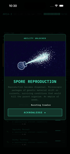 Most evolution games are tech trees with a biology skin. You click "unlock lungs" and lungs appear. In Primordial, lungs emerge because a coastal species accumulated enough adaptability over hundreds of generations to cross an invisible threshold. You didn't click a button — you spent hours keeping that species alive, deploying spore clouds to boost its adaptability, protecting it from predators with prey shelters, and transplanting it to the coast. When air breathing finally unlocks, it's YOUR achievement.